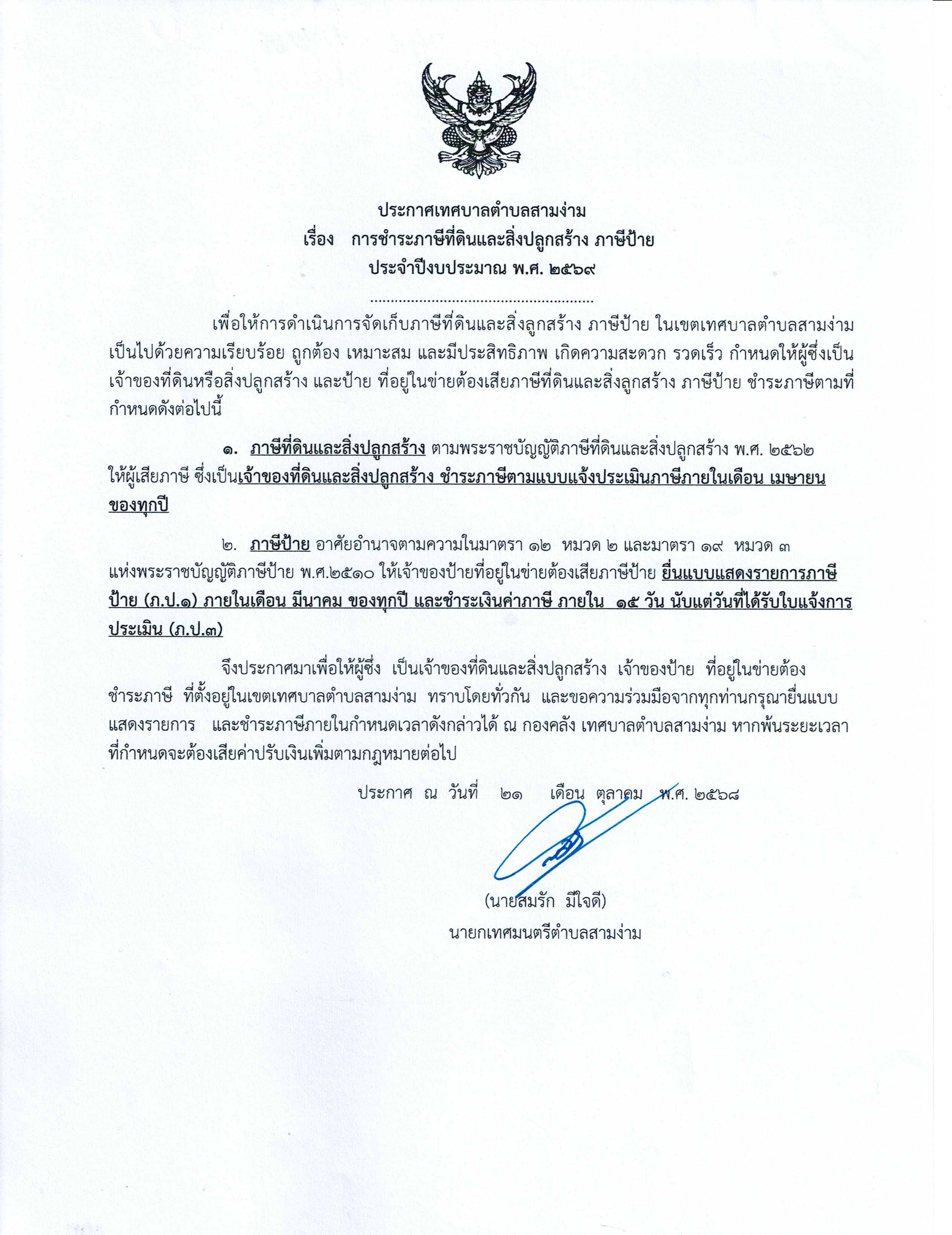 การชำระภาษีที่ดินและสิ่งปลูกสร้าง ภาษีป้าย ประจำปีงบประมาณ พ.ศ. 2569